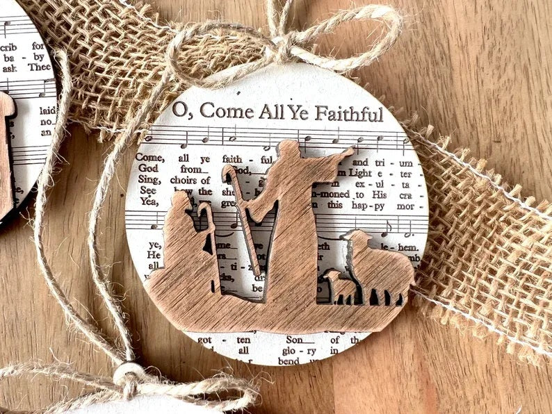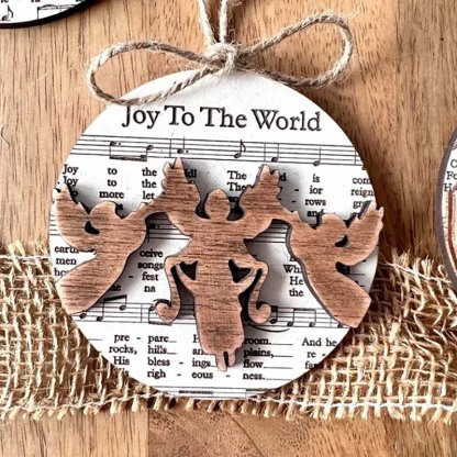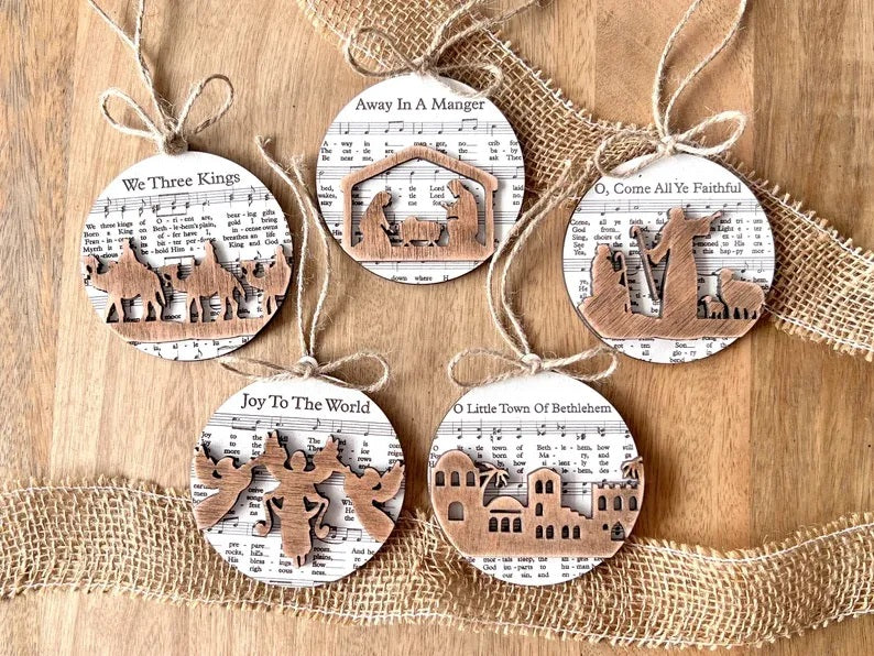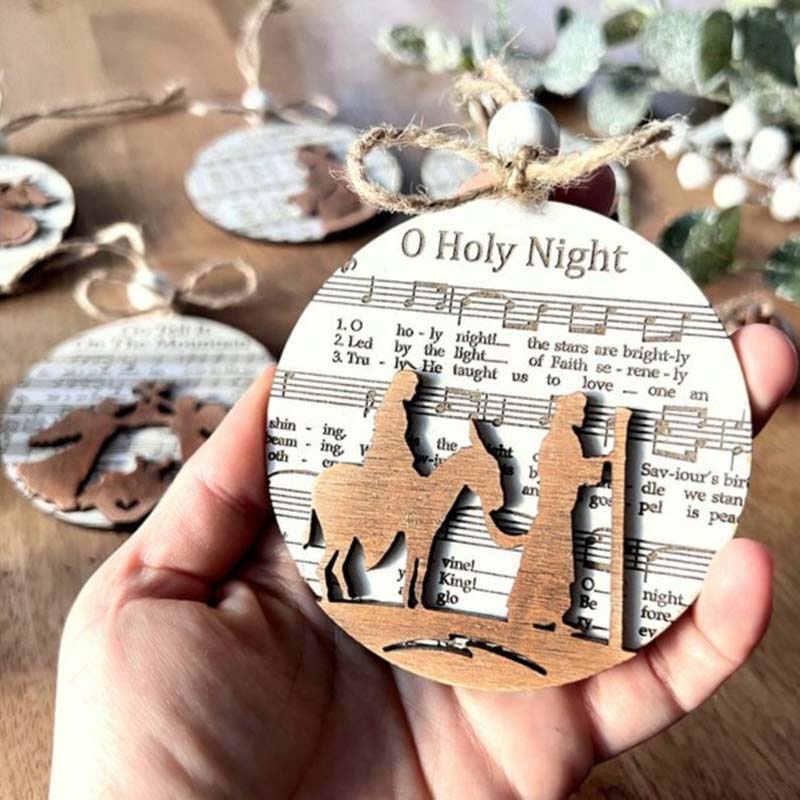 Each of these ornaments is also adorned with wooden relief decorations, enhancing their rustic charm. The "Music Sheet Nativity Ornaments" bring a harmonious blend of music, tradition, and nativity-inspired art to your holiday celebrations, making them a wonderful addition to your festive decorations.