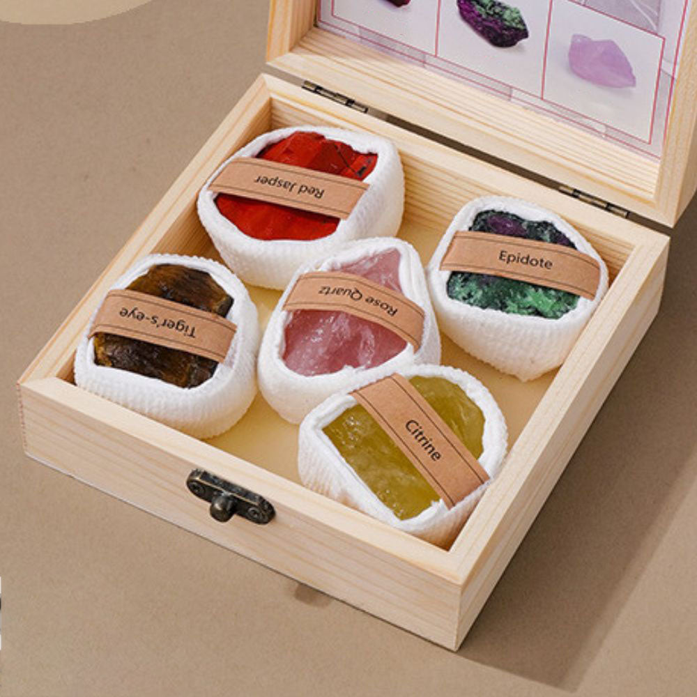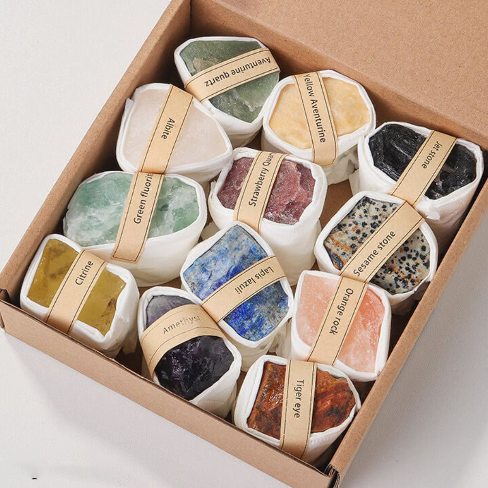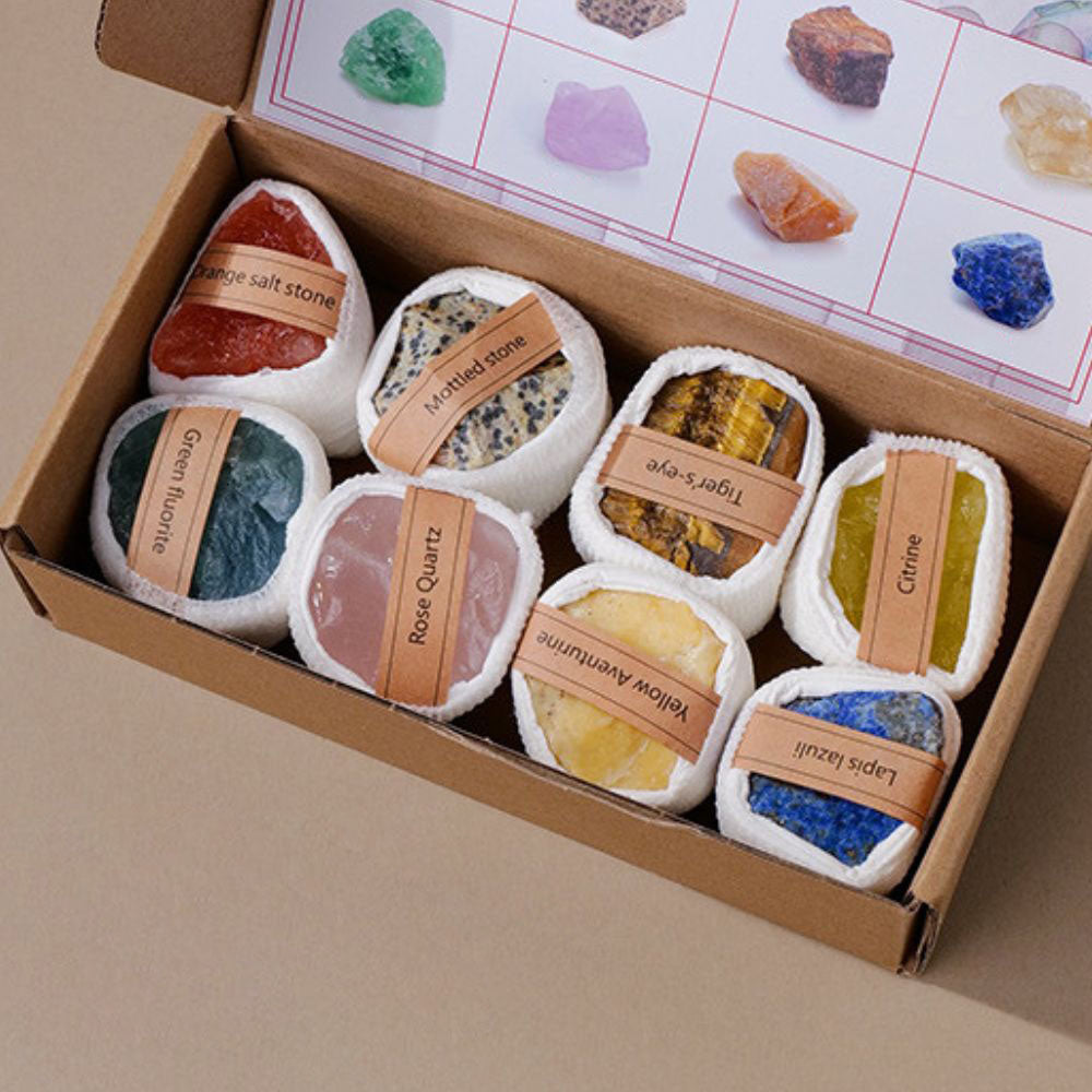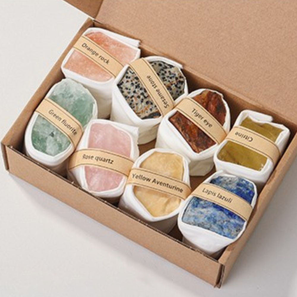 100% High Quality Natural Raw Stone Set Gift Box. Each crystal raw stone has a unique shape and veins.