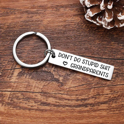 This funny keyring engraved with humor message “Don't Do Stup*d S**t” from Grandma/Grandpa.