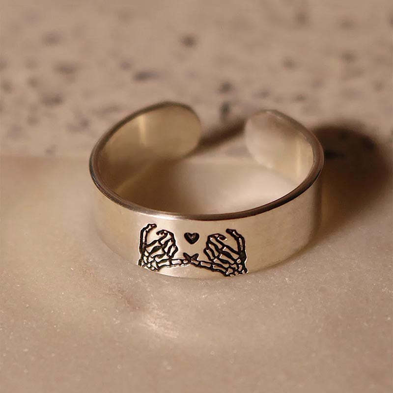 Featuring two skeleton hands with intertwined pinkies representing a pinky swear, this ring set demonstrates a pact made between you and your loved ones.