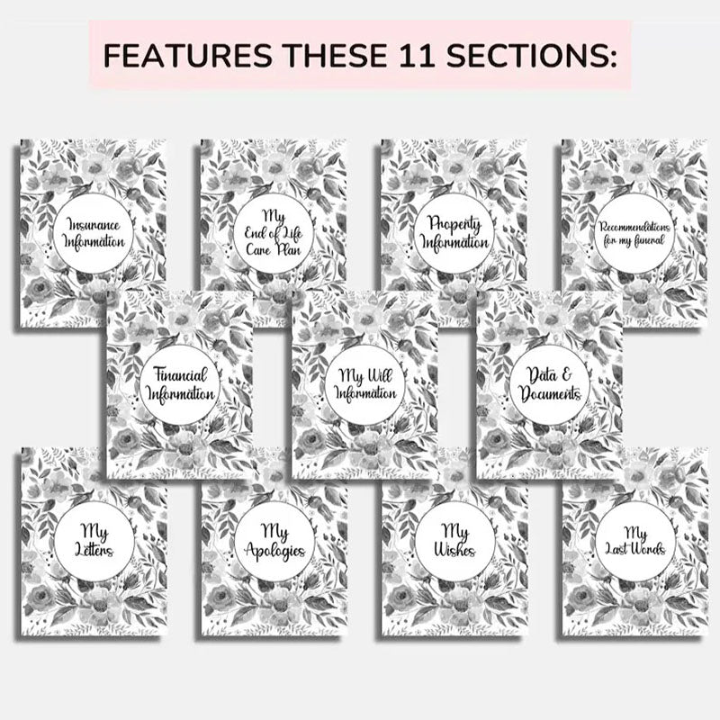 Our thorough and funny End of Life Planner covers everything your family and/or friends will need to know upon your passing or incapacitation.... from Financial Information to Insurance Information to End Of Life Care Wishes and more!