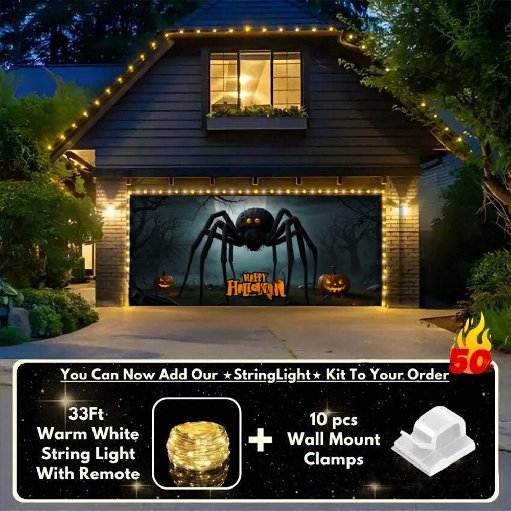 Featuring a colossal spider growling menacingly in a dark, shadowy forest, this Giant Spider Halloween garage door cover instantly transforms your home into a bone-chilling spectacle. A ghostly full moon bathes the scene in eerie light, amplifying the terror and turning your garage into a nightmare that will captivate—and terrify—every onlooker. Perfect for anyone hunting for creepy garage door decoration ideas this Halloween.