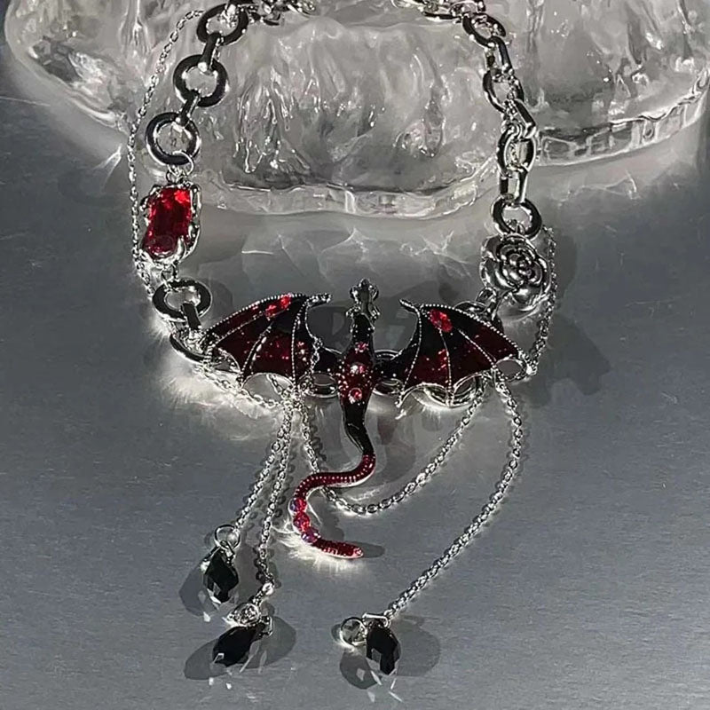 This striking piece of jewelry captures the essence of gothic allure with an intricately designed flying dragon, exuding power and mystery.