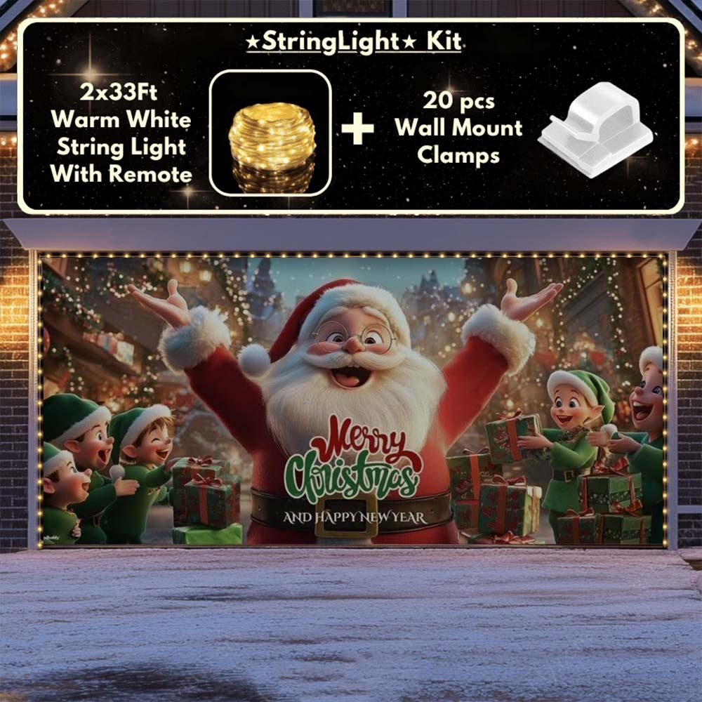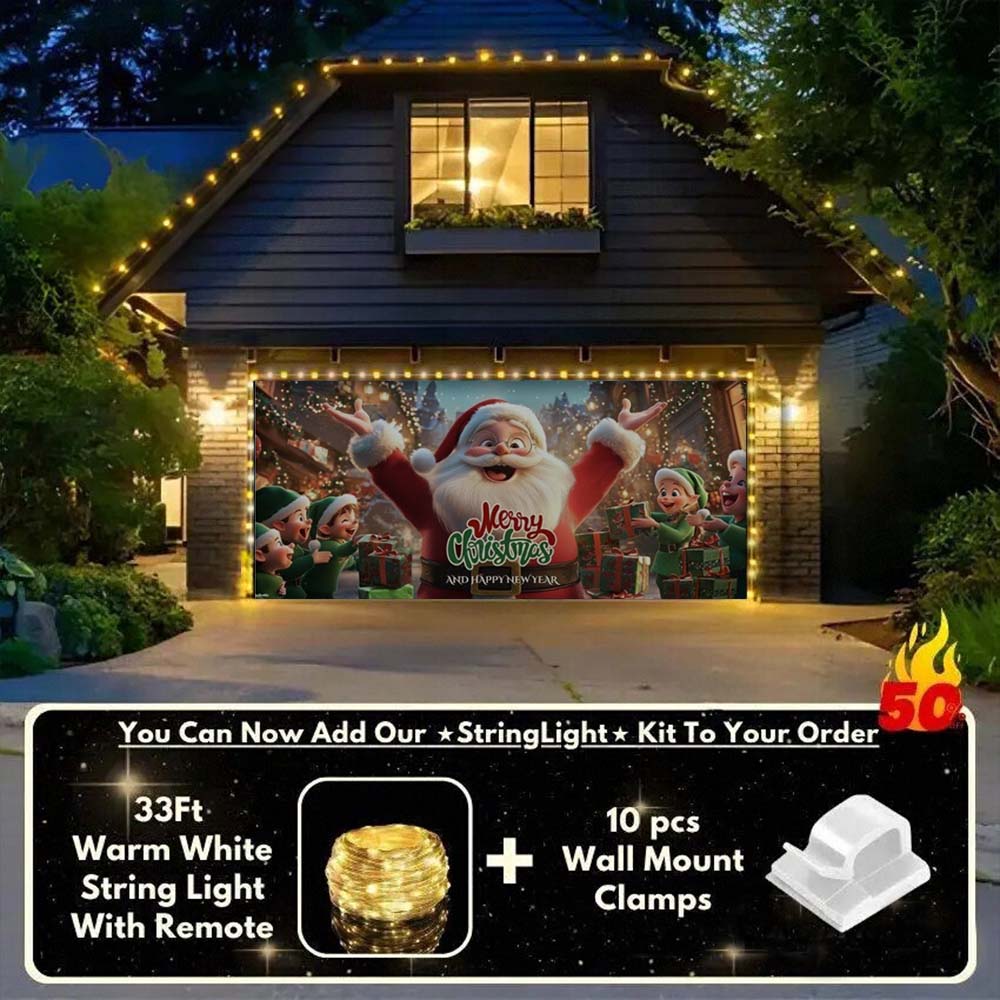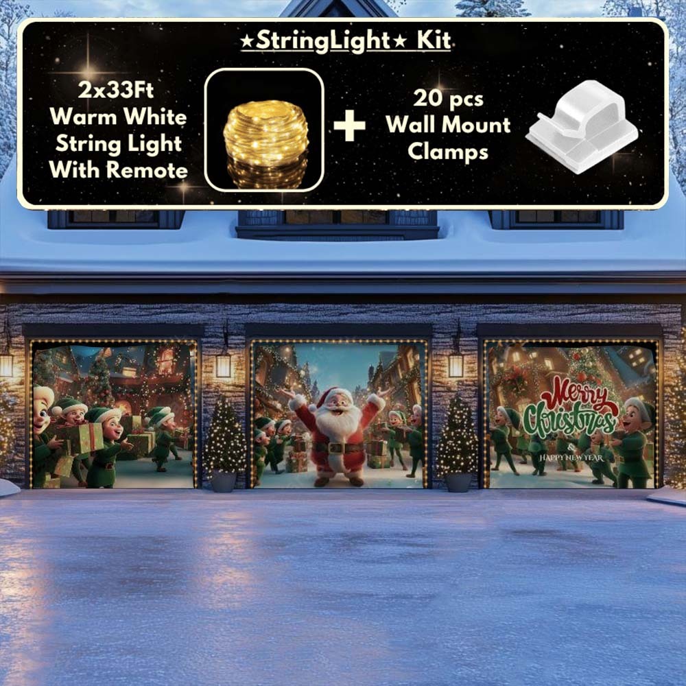Now you can elevate your holiday display with our string light kit-available at 50% off! Pair your Christmas Garage Door Cover with glowing outdoor Christmas lights and turn your garage into a true showstopper. The kit includes 1x 33 ft warm white string light, a remote control, and 10x sticky wall mount clamps.